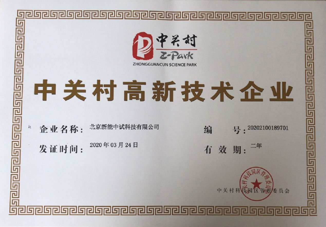 新能中試榮獲中關(guān)村高新技術(shù)企業(yè)證書(shū)